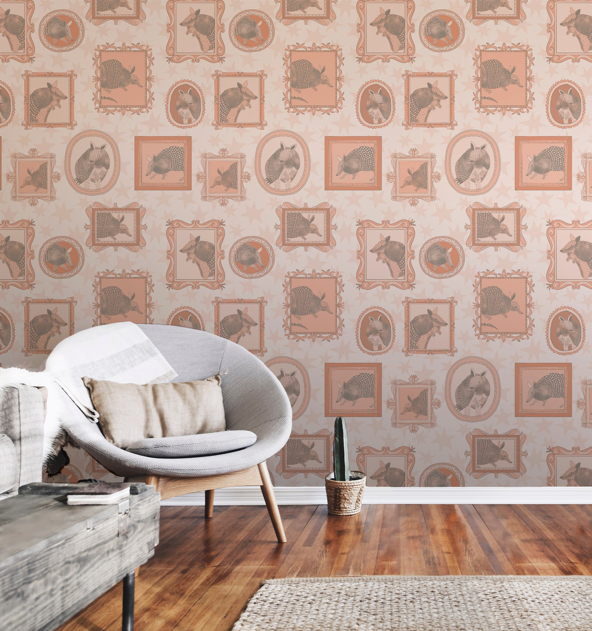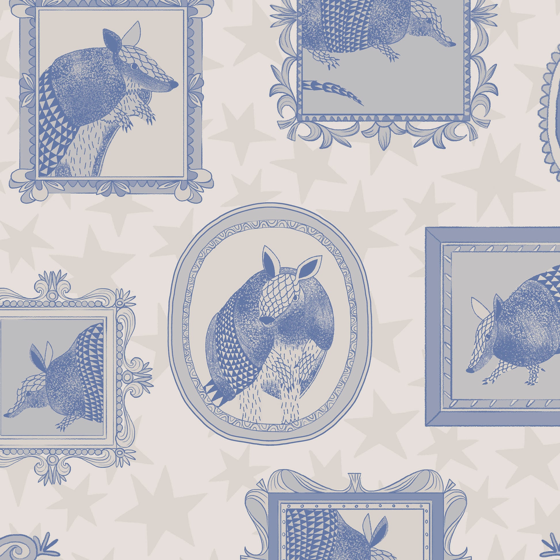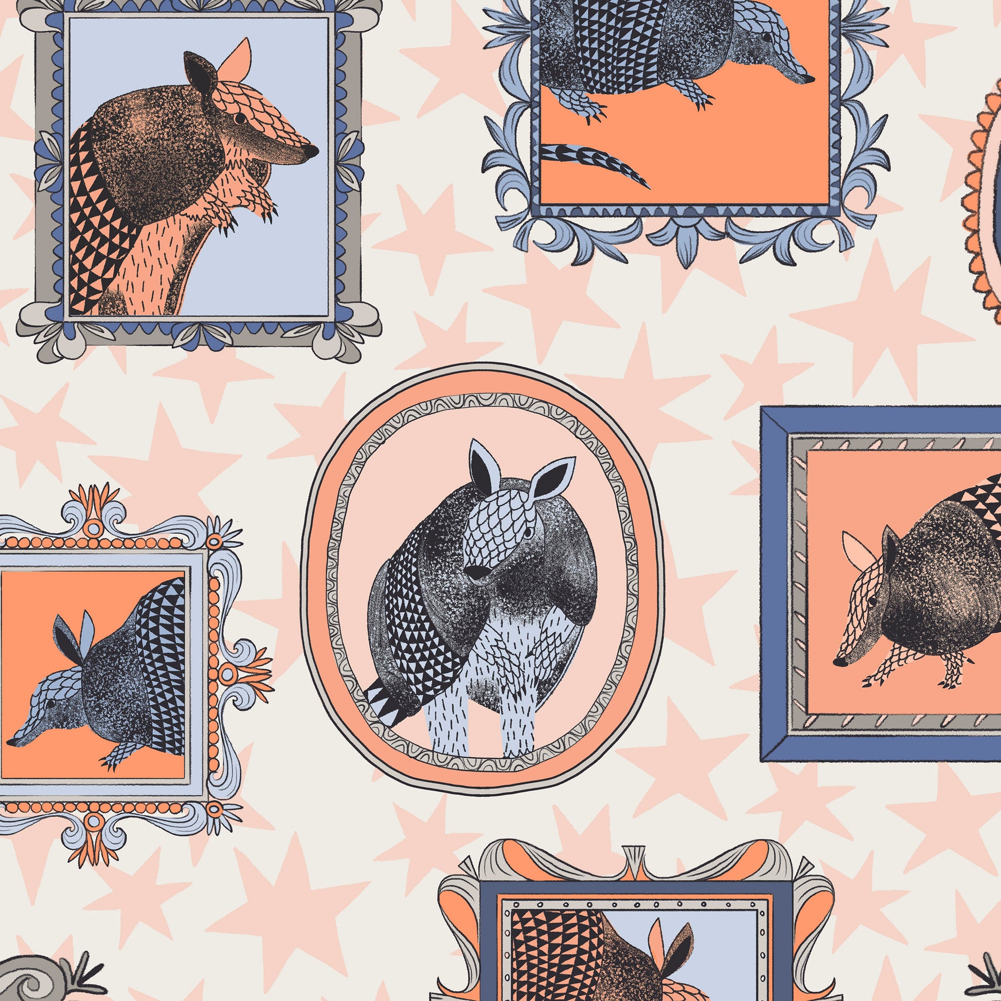 Tumbleweed Trail is a joyful wander through wide-open skies and roadside charm. Playful armadillos trot alongside twinkling stars, bold stripes, and bedazzled cowgirl boots, creating patterns that feel equal parts folk art and frontier daydream.