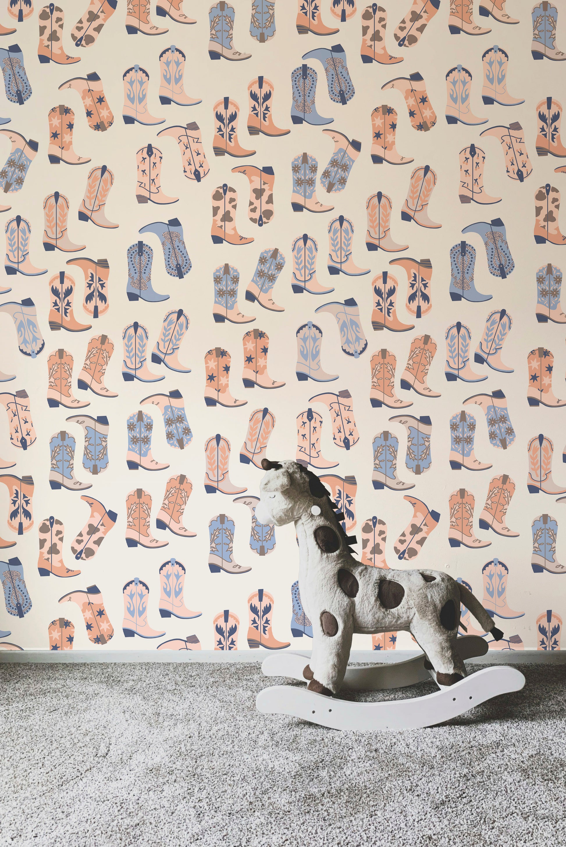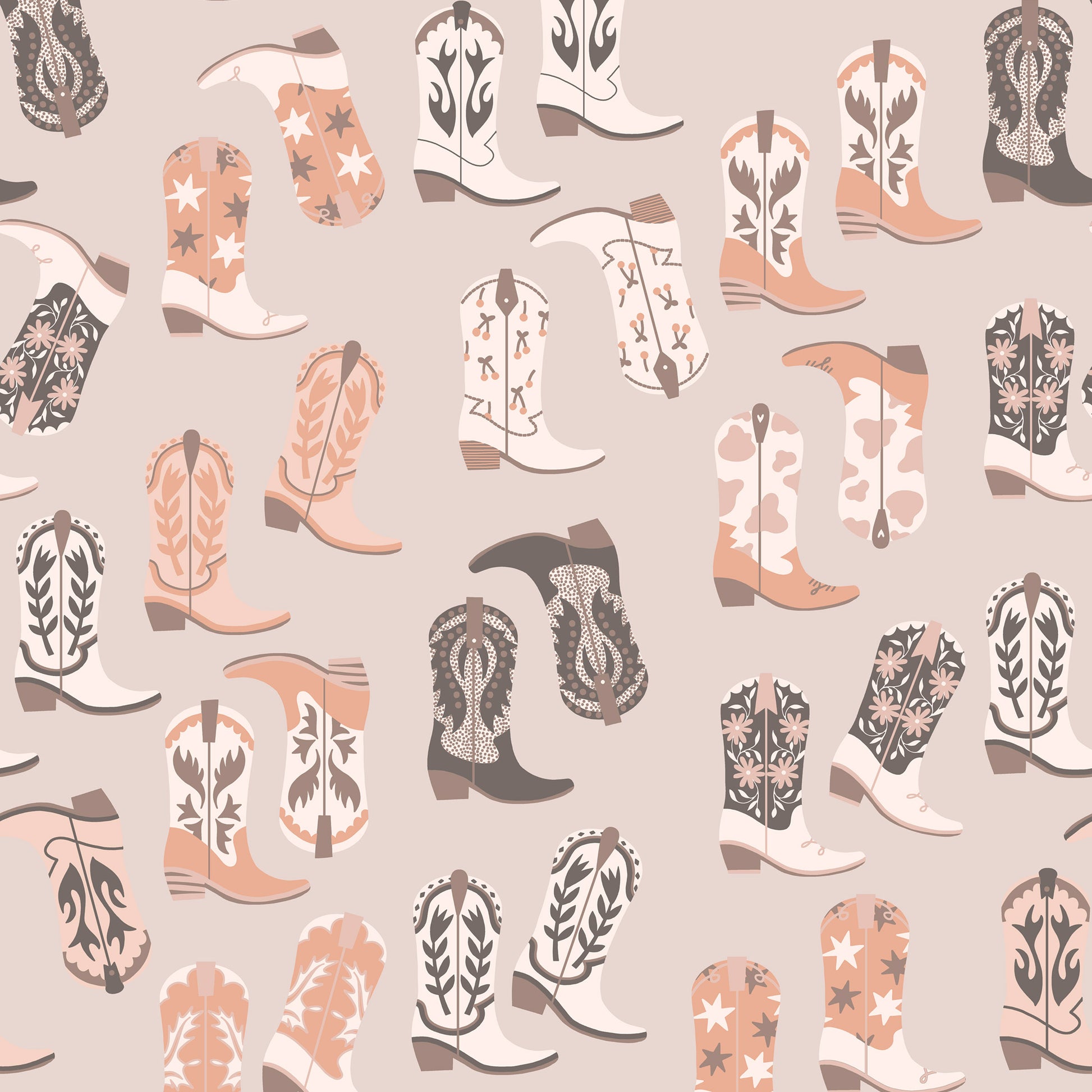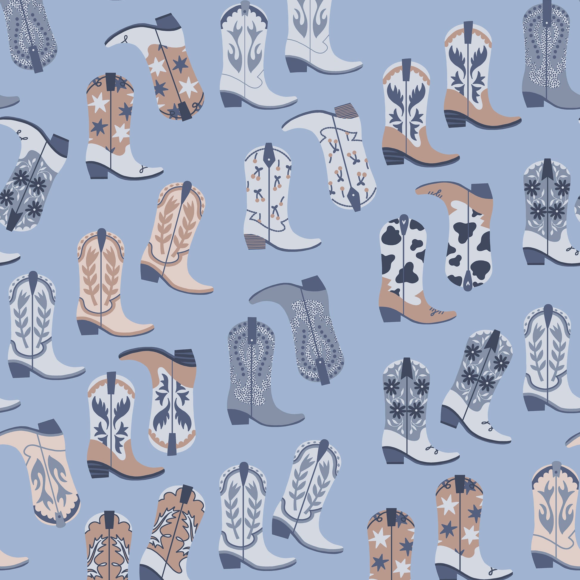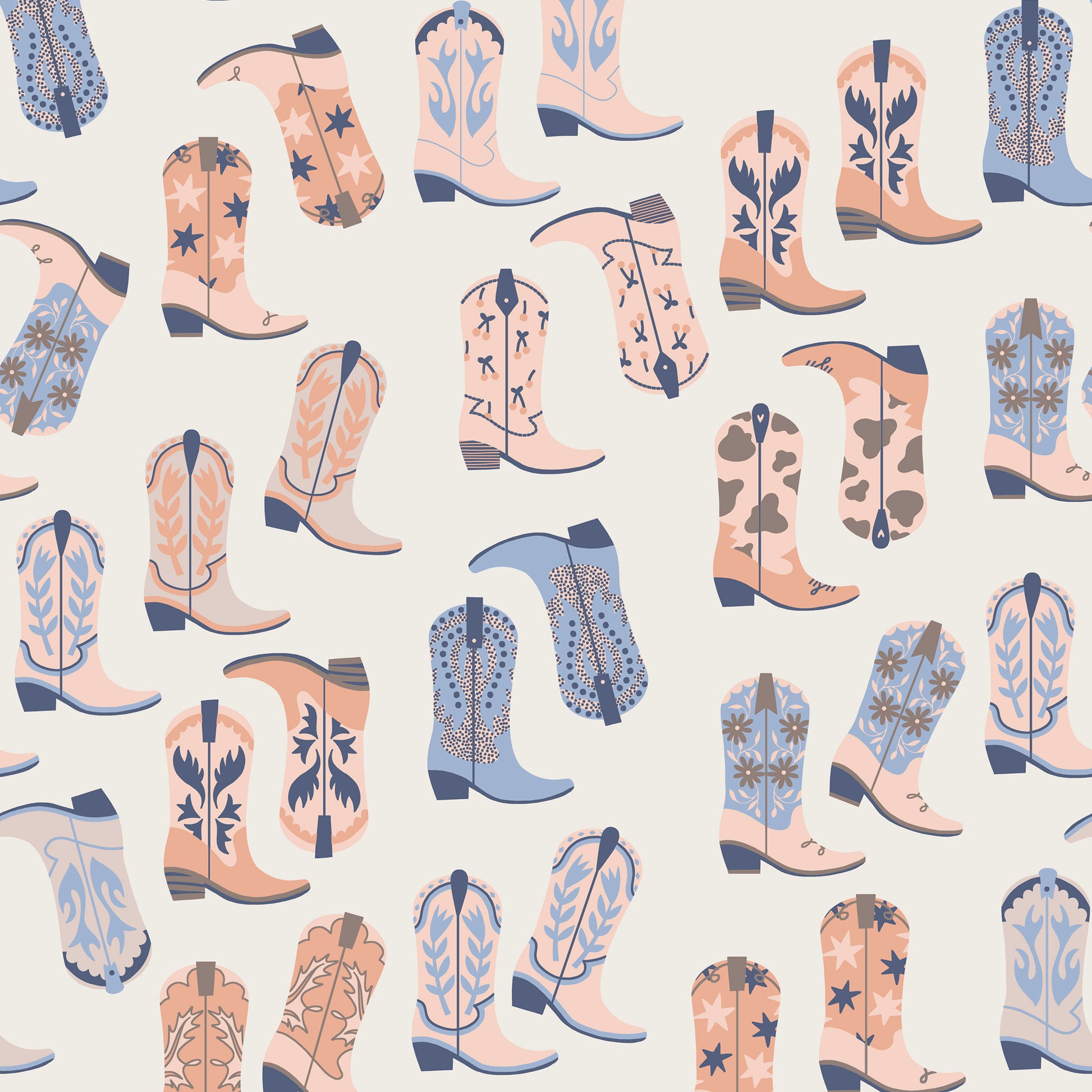 Tumbleweed Trail is a joyful wander through wide-open skies and roadside charm. Playful armadillos trot alongside twinkling stars, bold stripes, and bedazzled cowgirl boots, creating patterns that feel equal parts folk art and frontier daydream.